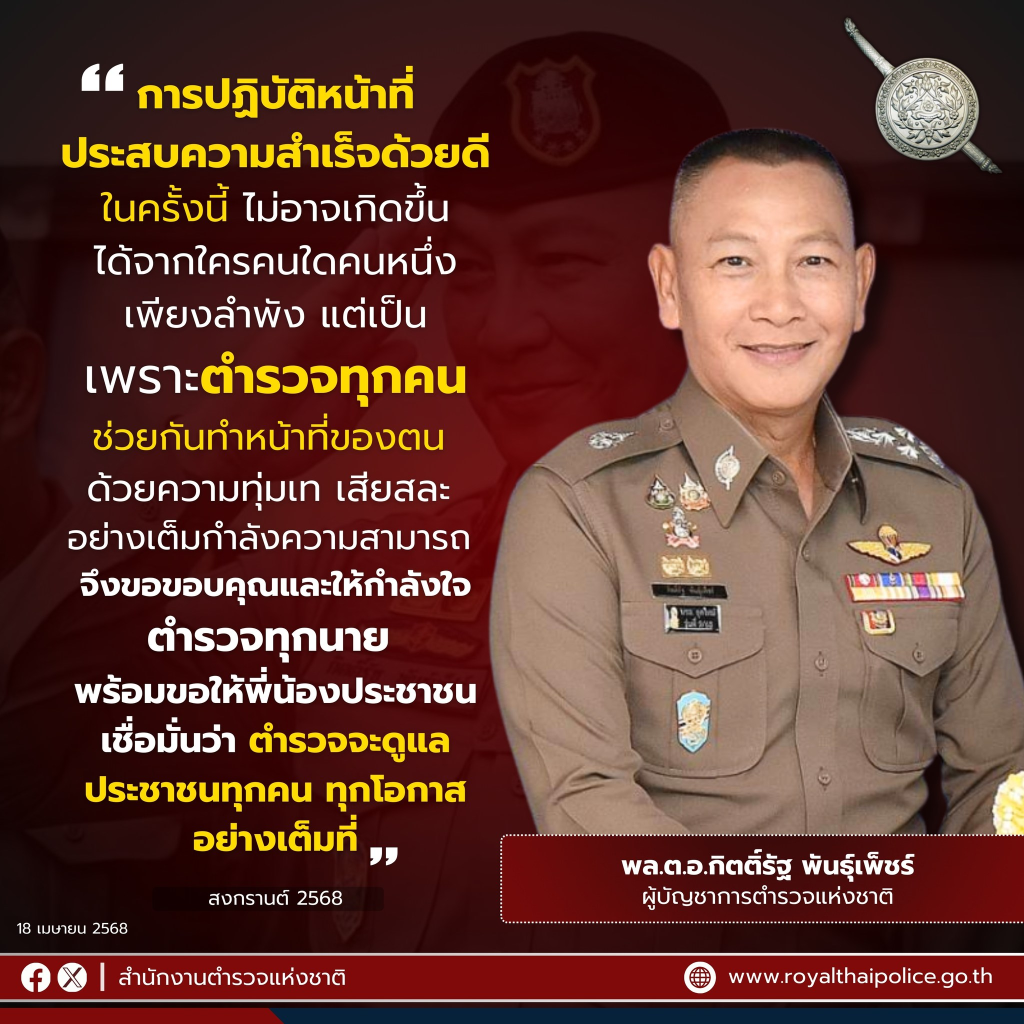 “ขอขอบคุณตำรวจทุกนายทั่วประเทศ ที่ร่วมแรงร่วมใจปฏิบัติหน้าที่ ดูแลความปลอดภัยและอำนวยความสะดวกการจราจรช่วงเทศกาลสงกรานต์ที่ผ่านมาอย่างเต็มกำลัง ทำให้ผลการปฏิบัติในภาพรวมเป็นที่น่าพอใจ”