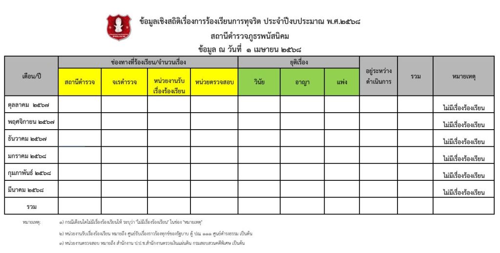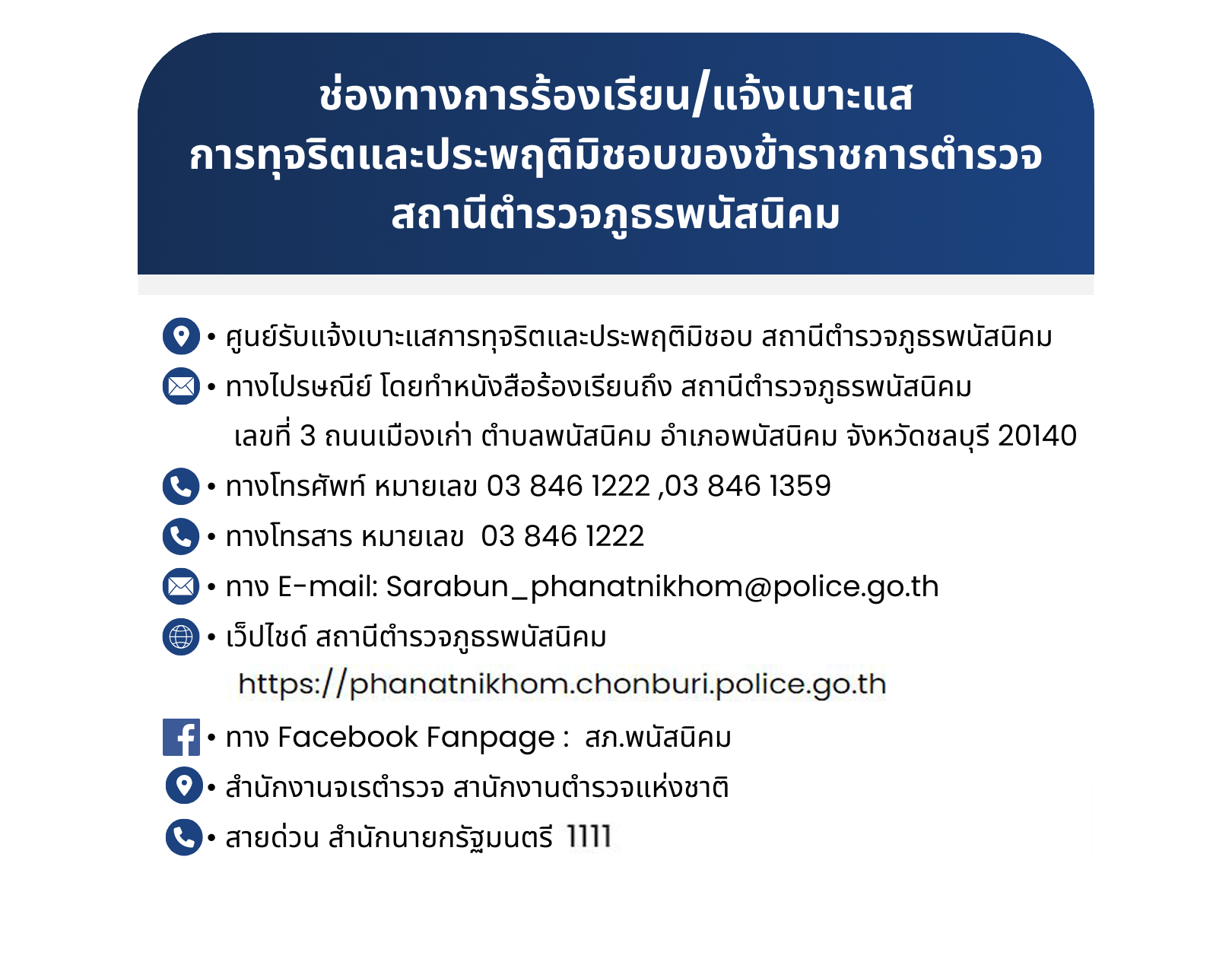 O17 ช่องทางการแจ้งเรื่องร้องเรียนการทุจริตและข้อมูลเชิงสถิติเรื่องร้องเรียนการทุจริต ช่องทางการแจ้งเรื่องร้องเรียนการทุจริต Click Here ร้องเรียนผ่านช่องทาง Facebook Fanpage ของสถานีตำรวจภูธรพนัสนิคม ร้องเรียนผ่านหน้าเว็บไซต์ ของสถานีตำรวจภูธรพนัสนิคม ชื่อ อีเมลติดต่อ ข้อความร้องเรียน Send กำลังโหลด… ข้อมูลเชิงสถิติเรื่องร้องเรียนการทุจริตประจำปีงบประมาณ พ.ศ. 2568 *** ข้อมูล ณ วันที่ 1 เมษายน 2568 *** สามารถ Download เอกสารได้ที่นี่ >>>
